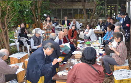 10月27日、成田市天神峰の市東孝雄さん宅離れで「天神峰カフェ」が開かれ、「星野さんをとり戻そう!全国再審連絡会議」の仲間をはじめ60人が集まった。