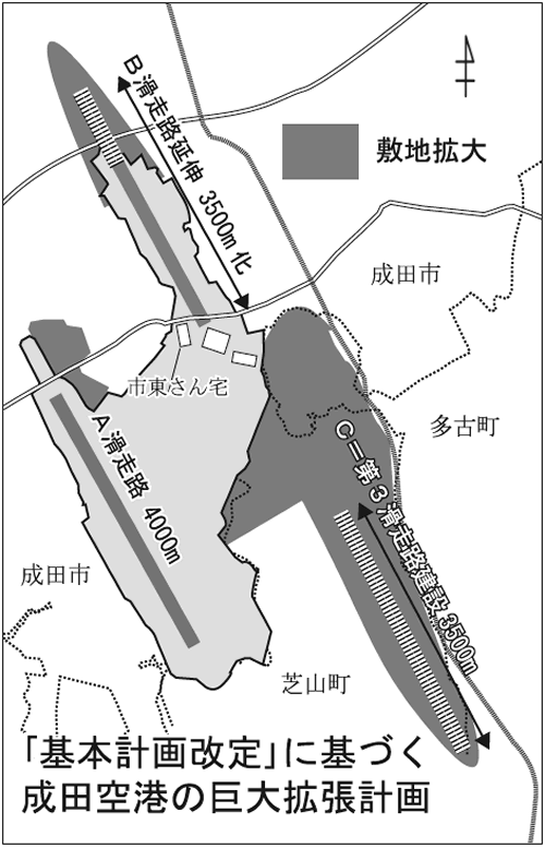 空港の発着容量を現状の年間約30万回から50万回にまで増やすため、現在の2本の滑走路に加え、新たに3500㍍の新滑走路(C)を芝山町北部を中心に建設する。そして現在のB滑走路を北に1千㍍延伸し3500㍍にする。敷地面積は現在の1198㌶から2297㌶(東京ドーム500個分)に拡張。総事業費は5千億円とされるが滑走路建設のみの見積もりで、新ターミナル建設でさらに巨額になる。