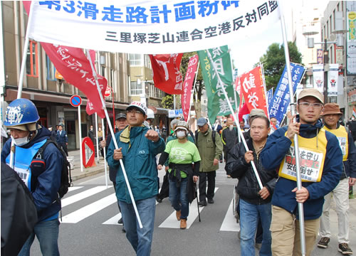 すでにNAAは芝山町(相川勝重町長)や推進派と結託して「用地取得」の活動を進め、民有地743㌶のうち696㌶について地権者から同意書を取得し、公用地と合わせて96%、1052㌶を取得済みだと言い張っている。だが「適正な価格での買収交渉に応じる」なる同意書をいくら集めても、用地を取得したことにはならない。実際には、反対同盟の粘り強い闘いに呼応し、住民から「機能強化反対」「これ以上睡眠を奪うな」の声がますます強く上がっている。天神峰の市東孝雄さんのように、一戸でも「絶対反対」を貫いてとことん闘う住民が現れるのを、敵は死ぬほど恐れているのだ。