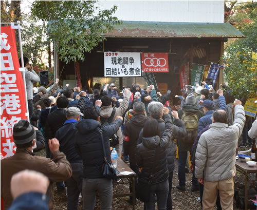『前進』や『週刊三里塚』でも見たことがある市東さんの南台の農地を出発してデモ行進をした後、天神峰の市東さん宅でいも煮や焼きそば等、三里塚の農地でできた野菜を使った料理を頂きました。秋の二度の台風災害にも負けずに立派に育ったネギが入ったいも煮は、外の寒さも加わってとても美味しく、市東さんをはじめ三里塚の皆さんの農業にかける誇りが伝わってきた気がしました。