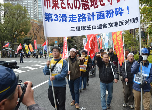午前11時30分、日比谷公園霞門に集合。太郎良陽一さんの司会でデモ前の打ち合わせを行った。東峰の萩原富夫さんが「国とNAAは耕作者の権利を無視して土地を取り上げようとしている。こんなことがまかりとおったら農民は生きていけない。『強制的手段は二度と用いない』と口にしたNAAが自らそれを踏み破ることを絶対に許さない」と訴えた。