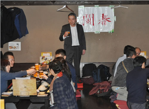 旗開きの冒頭、木村新委員長が乾杯の音頭を執った。続いて、反対同盟の伊藤信晴さんがあいさつに立った。市東さんの農地を守る決戦への参加を呼びかけ、茨城県からも空港機能強化反対の声が上がっていることを報告。動労水戸と共に闘う決意を明らかにした。