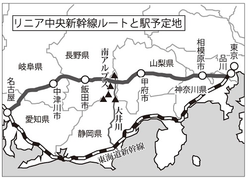 最高時速500㌔、東京―大阪間を1時間強で結ぶ超高速列車として、リニア新幹線の工事が進められている。2027年に品川―名古屋間開業、37年に大阪まで全線開業予定。総工費9兆円。全長286㌔、南アルプスを突っ切るルートで、トンネルが86%を占め、工事による残土は合計約5680万立方㍍(東京ドーム50杯分)。無人運転で、中央制御室から全便をコントロールする。