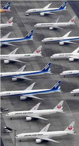 (写真 羽田空港の駐機場に並べられた飛べない機体)