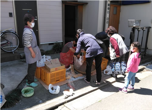 ところが、新型コロナウイルスの緊急事態宣言下に突入。たくさんの人を集めていいの? 私たちも混んでいる電車に乗るのは大丈夫? といった迷いもありました。でも、子どもたちは学校や保育園が休みで家に閉じ込められ、ストレスたまっている。お父さんお母さんも仕事が休みになったり、感染の不安を抱えながら仕事に行かざるをえなかったり。こんな時こそ体にいい野菜食べて元気になってほしい。いい野菜食べて免疫力アップしてほしい。何よりケース野菜なら、スーパーに並ばなくても大丈夫。だからやろう! スタッフも電車やバスは使わずに自転車で集まる。お客さんがたまらないように小分けにする。ビニール手袋など感染対策も準備して開店を迎えました。