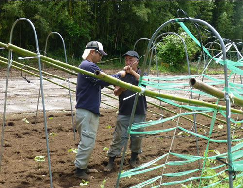 (写真 市東さんの天神峰農地でゴーヤーの苗を植え、ネット張り作業を行った【24日】)