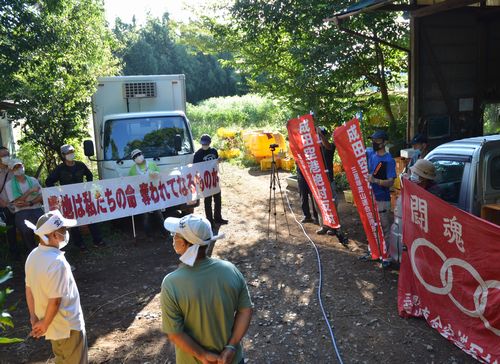 (写真 市東さん宅中庭で農地を守る決意固め【25日】)