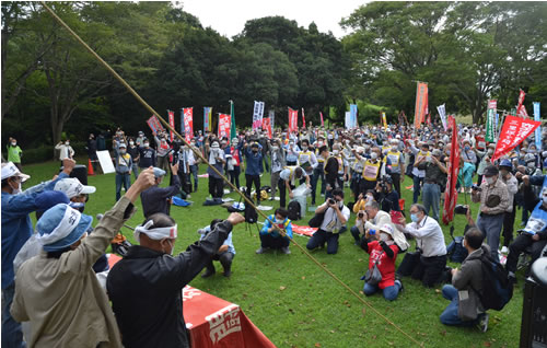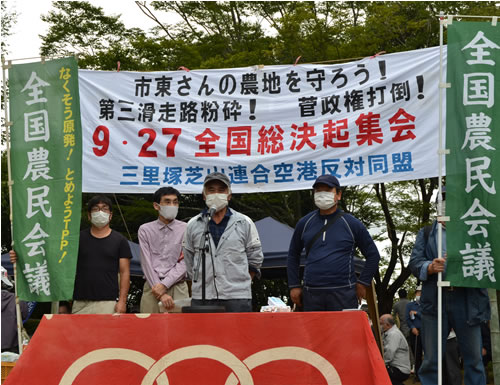 「市東さんの農地取り上げに反対する会」と各地の「農地を守る会」が壇上に並び決意を表した。群馬・守る会の大塚正之さんは、9・13高崎集会の成功を報告した。
