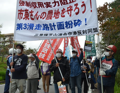 最後に太郎良さんが、集会宣言を読み上げ、団結ガンバローの音頭をとり、反対同盟を先頭にデモに出発した。宣伝カーからは宮本さんの「第3滑走路阻止」の訴えが空港のために造成された町=成田ニュータウン一帯に響く。