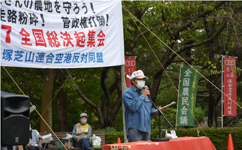(写真 三里塚全国総決起集会の基調報告を行う萩原富夫さん【9月27日 成田市赤坂公園】)