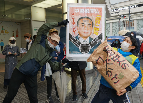 中曽根康弘の「国葬」弾劾行動では、JR品川駅高輪口でスピーチリレーを行いました。中曽根は戦時中は海軍将校として軍隊慰安所の設置に積極的に関わり、戦後は初代原子力委員会委員長として原発建設の先鞭をつけた人物です。首相任期中には国鉄分割・民営化を強行し、労働組合を弱体化、後に派遣労働者が増える原因を作った人物でもあります。三里塚でも成田空港の2期着工を強行した張本人です。