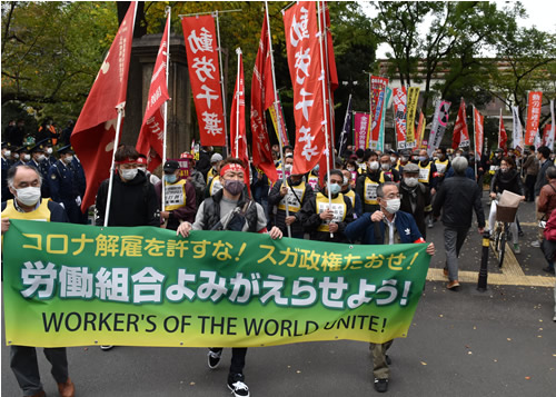 集会後、銀座デモに出発。「コロナ解雇許すな!!」「スガやめろ!!」の訴えに沿道からは圧倒的注目と支持の声が集まった。