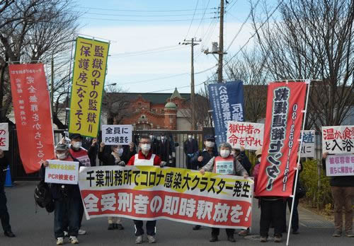 (写真 コロナ感染の大クラスターが発生した千葉刑務所の全受刑者を直ちに釈放することを求め抗議行動に立った【2月24日】)