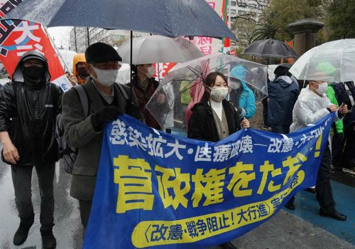3月21日、「改憲・戦争阻止!大行進」実行委員会が呼びかける「いのち守れ!オリンピックやめろ!菅たおせ!大行進」集会が東京・日比谷野外音楽堂で開かれ、520人が集まった。