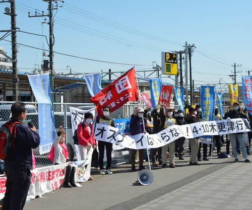 4月10日、動労千葉を支援する会・木更津と改憲・戦争阻止!大行進千葉が呼びかける「オスプレイはいらない!4月10日行動in木更津」に、首都圏から130人が結集した。JR木更津駅前でのリレートーク後、陸上自衛隊木更津駐屯地にデモを行った。