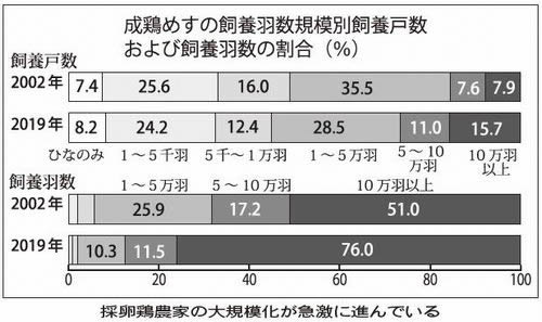 今から30年くらい前にオランダで、夫婦2人が養鶏10万羽を飼っていた。日曜日に小学生の子どもがオートパッカーで卵を取っていた。地域で2000万羽いて、鶏を移動する専門の会社、掃除する会社もあった。夫婦2人で毎日、卵を取っていればいい。物事を合理的に考えている。