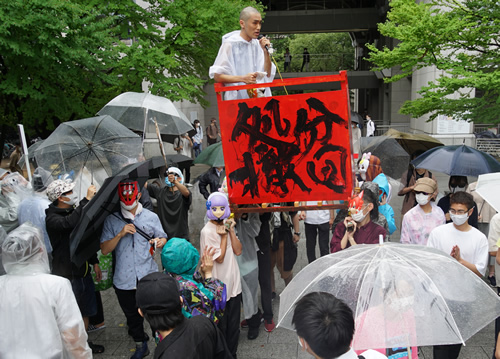 7月7日、京都大学において「全学処分阻止・撤回集会」が開催され、参加しました。激しい雨の中でしたが、対面授業が再開したこともあり、多くの学生がその場で足を止め、注目する集会となりました。昨年12月に開かれた処分撤回集会で使われたみこしが入構し、集会がスタート。基調提起に続いて、教員2名からの連帯発言。そして、2月に始まった新たな処分に向けた呼び出し策動を粉砕し続けている当該学生2名が発言し、権力による分断攻撃である処分を粉砕する展望を示しました。その後、この春入学してきた1回生2名、各学部の学生が発言し、運動がこの間拡大してきたことを示しました。