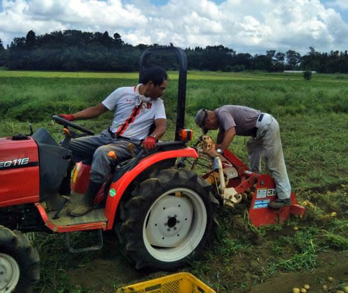 7月25日、ついにジャガイモ掘りが完了しました。掘られたジャガイモは選別後、米の紙袋に詰めて貯蔵されています。跡地は雑草が伸びる前にすぐ富夫さんが大型トラクターで耕し、玉ネギを植える予定地として整備されています。