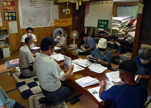 夕方、再び離れに集まった仲間は一日の集約を行った。市東さんは参加者の労をねぎらい、「同盟ニュースを周辺住民に届け、地道にがんばろう」と鼓舞した。次回行動日は9月19日。