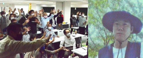 8月30日の東京・丸の内での本社追及行動の様子がビデオで流された上、チャホノ支会長がオンラインでスクリーンに登場。「THAADミサイル配備と闘う現場にいる」と切り出し、判決に満足せず解雇された組合員全員の職場復帰まで闘う意志を表明。集会参加者は、日韓の強い連帯を誓った。(写真)
