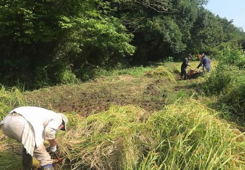 (写真 市東さんの水田で手刈りする髙田隊員【13日】)