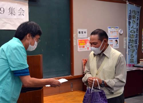 田島さんから市東さんに梨の詰め合わせと、高階文庫の農園の無農薬有機栽培の小麦で作られた焼きまんじゅうがおみやげとして贈られ、「守る会」で集めた会費とカンパが手渡された。市東さんからは参加者に、畑で獲れたジャガイモがプレゼントされた。