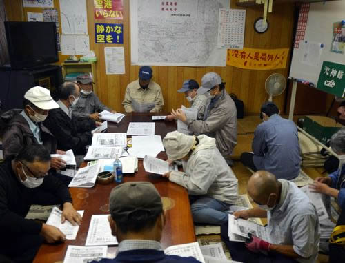 B滑走路の北延伸で移転対象となる地域の農家は、移転の準備を進めながらも、田畑を手放すか、遠くからでも通うかの「去るも地獄。残るも地獄」の状況で苦しい胸の内を語った。そんな中でも「移転は拒否しようと思っている」という住民もあり、機能強化反対で共にがんばろうとエールを交換した。