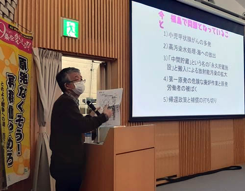 さらに汚染水海洋放出問題をパワーポイントを使って展開し、危険性と破綻的な現実が強調された。もはや風評ではなく実害そのもので、衆議院選での福島・自民党の大敗は、汚染水問題など「棄民」施策への怒りの深さが実感できたという。