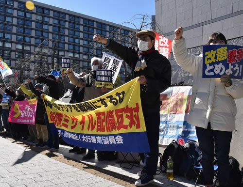 対中国の侵略戦争へ向けて改憲攻撃が急加速している。自民党の改憲実現本部が5月連休前までに全都道府県での改憲集会を方針化。1月26日の国会答弁では岸田が、集団的自衛権として敵基地攻撃能力を行使する狙いを明確にし、2月16日には岸防衛相が自衛隊戦闘機が相手領空内に入って軍事拠点を爆撃することができると言い放った。補正予算と合わせて6兆円を超える大軍拡予算。「専守防衛」の建前もかなぐり捨てて先制攻撃も合法化するようなとんでもない議論が噴出している。