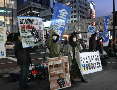 同日夕方、全学連を先頭に新宿駅前でロシア軍のウクライナ侵攻に抗議し反戦決起を呼びかける宣伝行動に100人が立った。