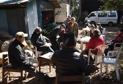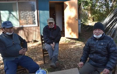 昼下がりの晴天のもと、反対同盟、支援連絡会議、首都圏の仲間たち15人が天神峰の市東孝雄さん宅離れ前の中庭に集い、まずはコーヒーとお菓子で和やかに歓談。