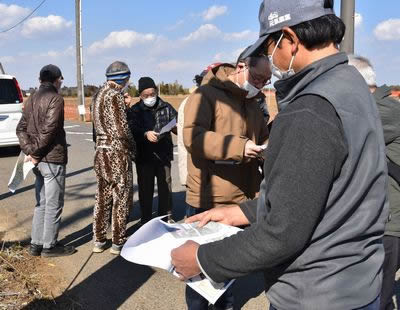 現地闘争本部の同志がつくったカラー地図の資料が配られ、参加者一同は車に分乗しフィールドワークに出発。