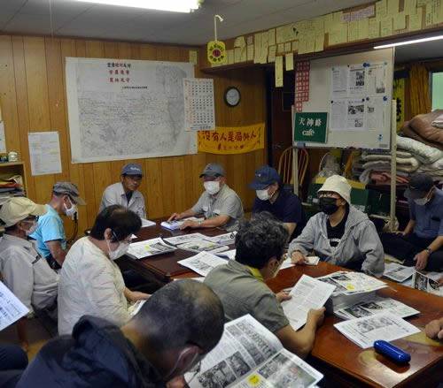 午前8時半、反対同盟と支援連は市東孝雄さん宅離れで朝の打ち合わせとビラの折り込み作業をした。今回は、反対同盟ニュースと7・3樫の木まつりのカラービラの2種類が配られる。同盟ニュース2面に掲載した新看板「Close the Airport!(空港を閉鎖せよ)」に注目が集まり、口々に「いい写真だ」との感想が出された。