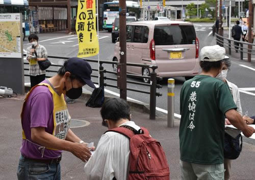 ●「東海第二原発いらない!首都圏ネットワーク」の呼びかけに応え、反対同盟と支援連が京成成田駅前で、東海第二原発再稼働阻止を訴える4回目の一斉行動に立った。(11日=写真)