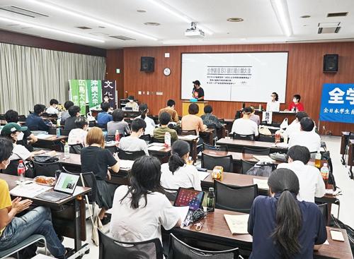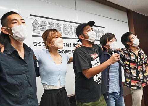 全学連大会の討論では、戦争の時代に学生はどうあるべきかをめぐる真剣な議論が行われ、「処分や大学改革は戦争国家化攻撃と一体」「改憲阻止にこだわろう」「あらゆる闘いを戦争阻止へ」などの意見が活発に出されました。参加者全体で総括議案、情勢議案、方針議案で明らかにしたことを確認しました。赤嶺知晃・全学連委員長は「あらゆる反動を打ち破って、労働者の国際連帯で戦争に反対し、新自由主義を終わらせる闘いをつくる運動と連帯し、私たちが新たな人類の歴史を作り出そう」とまとめました。