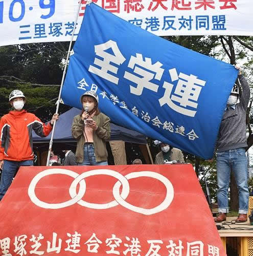 ●三里塚全国集会が成田市赤坂公園で開催され、452人が結集した。(9日=写真は発言に立つ矢嶋尋副委員長)
