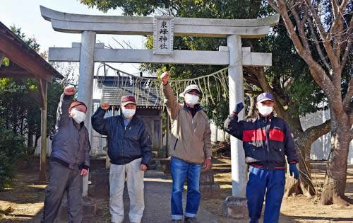 旗開きに先立ち、反対同盟は東峰神社のしめ縄の付け替えを行った。頭上40㍍をジェット機が轟音を立てて通過する中、手際よく作業を終えた上、市東さんの南台の耕作地に移動。雲一つない晴天のもとに、それぞれの旗・のぼりを立てて集まった人々が新年のあいさつを交わし合う。