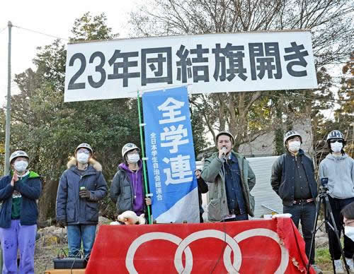 白ヘルメット姿の全学連が並び、代表して赤嶺知晃委員長が決意表明を行った。岸田政権の中国侵略戦争へ向けた攻撃に対し、反戦闘争を実力で展開し、市東さんの農地を守り抜くことを誓った。