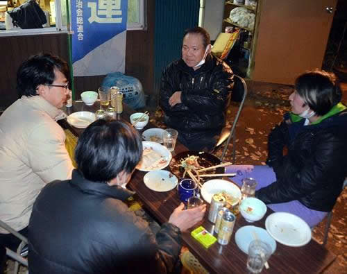 28日の忘年会では、反対同盟、年配の支援者たちと全学連の学生とが、胸襟を開いて杯を交わし語り合った。60年代、70年代、80年代の闘いを昨日のことのように語る先輩たちと、2000年前後に生まれた今の学生たちが三里塚闘争の歴史を共有し、実力闘争に確信を深めた。