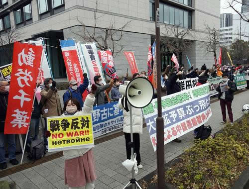 通常国会開会日の1月23日、改憲・戦争阻止!大行進東京の仲間160人は国会前に登場し、「軍拡・戦争国会粉砕」を訴えた。