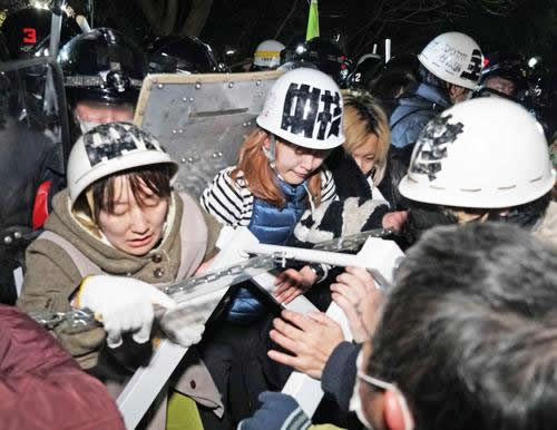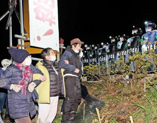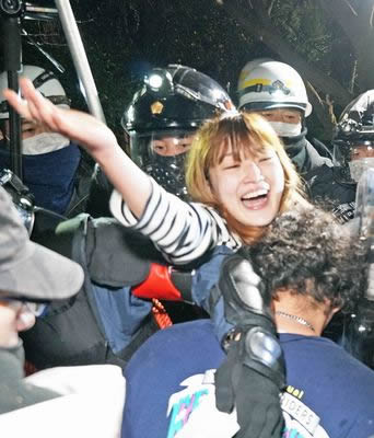 15日の日暮れ、15日中の強制執行攻撃を跳ね返せたかと思った矢先に、NHKが「今夜強制執行」と報じているとのニュースが飛び込んできました。国家権力は夜になってから盾や警棒を持った何百という機動隊、重機、放水車をもって市東さんの農地を強奪しにやって来たのです! 襲撃を知らせる仲間の笛が鳴り響き、一瞬のうちに数百人の機動隊が団結街道になだれ込みました。私は団結街道と市東さんの敷地の間で仲間たちとスクラムを組んで機動隊の侵入を阻止しました。対峙する機動隊員は、自ら暴力的襲撃をしておきながら、私たちに向かって「押さないでください」「危ないですよ」「けがしますよ」などと絶叫。国策のために農地を強奪し、それに反対するものを暴力でねじ伏せるという国家権力・ブルジョアジーによる「治安維持」のなんと欺まん的なことか。団結街道で攻防していた私たちは1〜2時間ほどで、十数人がかりで四肢を掴まれて強制排除されました。機動隊は「女性は女性隊員が排除します」などと大宣伝していましたが、全くの大嘘です。私は強制排除されながら、何人もの男機動隊員の急所に唯物論的打撃を与えました。