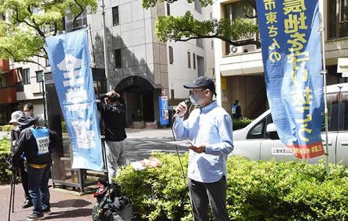 千葉地裁民事第3部(岡山忠弘裁判長)で5月12日、団結街道裁判が開かれた。前日の大弾圧に対する怒りに燃えて、反対同盟と支援連の仲間たちは裁判傍聴を前に、不当捜索を許可した千葉地裁の門前に朝から陣取り、弾圧粉砕、逮捕者全員の即時釈放を訴えて怒りの抗議活動を行った。