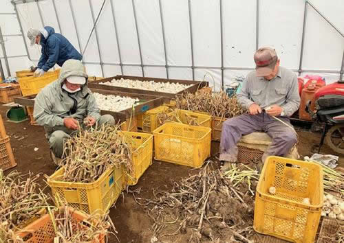 (写真 市東さん宅ハウスでニンニクの根切り【23日】)