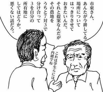 藤﨑は、①市東家のもともとの賃借地の位置を確認し、現在の耕作地がそれと違ってるなら来春の種付けから元にもどしてほしいと要請した。②その賃借地を7対3の面積で分筆し、3を市東家の所有地とする(7を藤崎に明け渡す)ことを提案してきた。