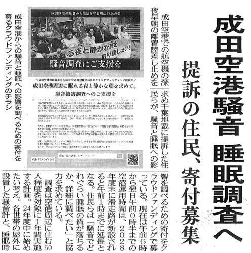 8月22日、「成田空港の騒音から生活を守る周辺住民の会」が、成田空港からの騒音と睡眠への影響を調べるための寄付を募るクラウドファンディングを始めたと報じられた。