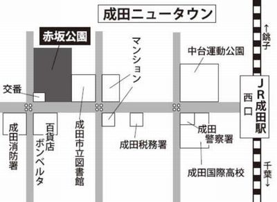 (JR成田駅西口バス2番線発①中台線「赤坂公園」下車②中央通り線「保健福祉館」下車)