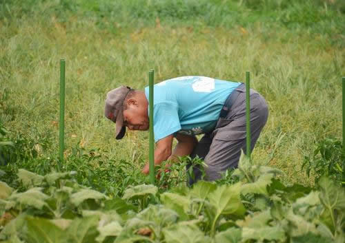 (写真 南台農地でししとうを収穫する市東さん【7月31日】)