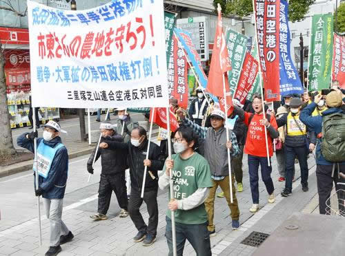 続いて動労千葉副委員長の中村仁さんが自民党の金権腐敗政治を弾劾し、農地決戦勝利を誓った。さらに連帯発言を受け、太郎良陽一さんのリードで力強くシュプレヒコールを上げ、市内デモに出発。宣伝カーからは婦人行動隊・宮本麻子さんが、農地強奪と岸田政権の戦争・軍拡政治を弾劾するアピール。