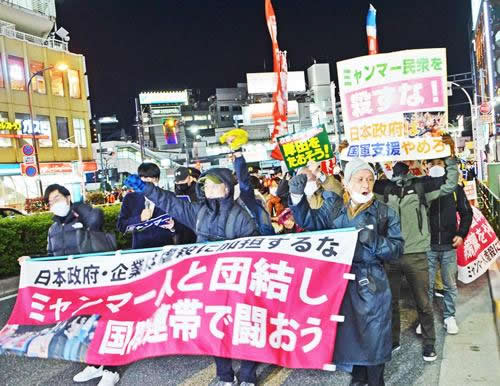 ピンスポット ミャンマー連帯デモ意気高く 早稲田通りを席巻 岸田は虐殺に加担するな!