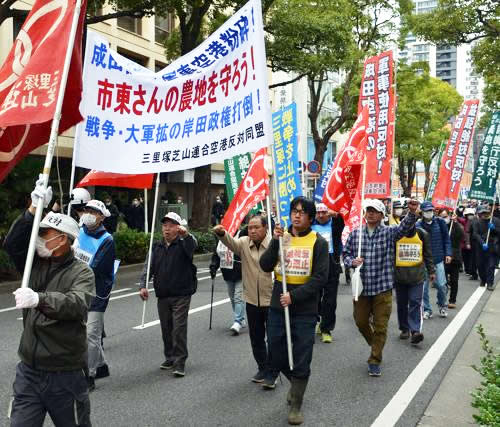「成田空港機能強化の準備工事が今進められているが、これに対し2月28日に芝山町菱田をデモする現地闘争を行う。自民党・岸田政権の戦争政策の一環として成田空港を戦争のできる空港へと造り変えることが、機能強化の狙いだ。諸先輩方の命がけの闘いの歴史を継いで、市東さんの南台農地を守り、第3滑走路建設を許さず、軍事空港を粉砕する」